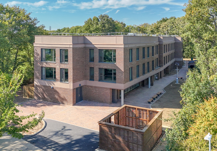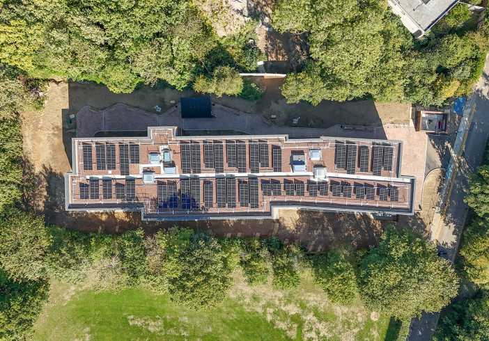 Sitting adjacent to an area of ancient woodland, the development places green design principles and sustainability at its heart. Extensive photovoltaic (PV) panels and a green roof further enhance its environmental credentials.